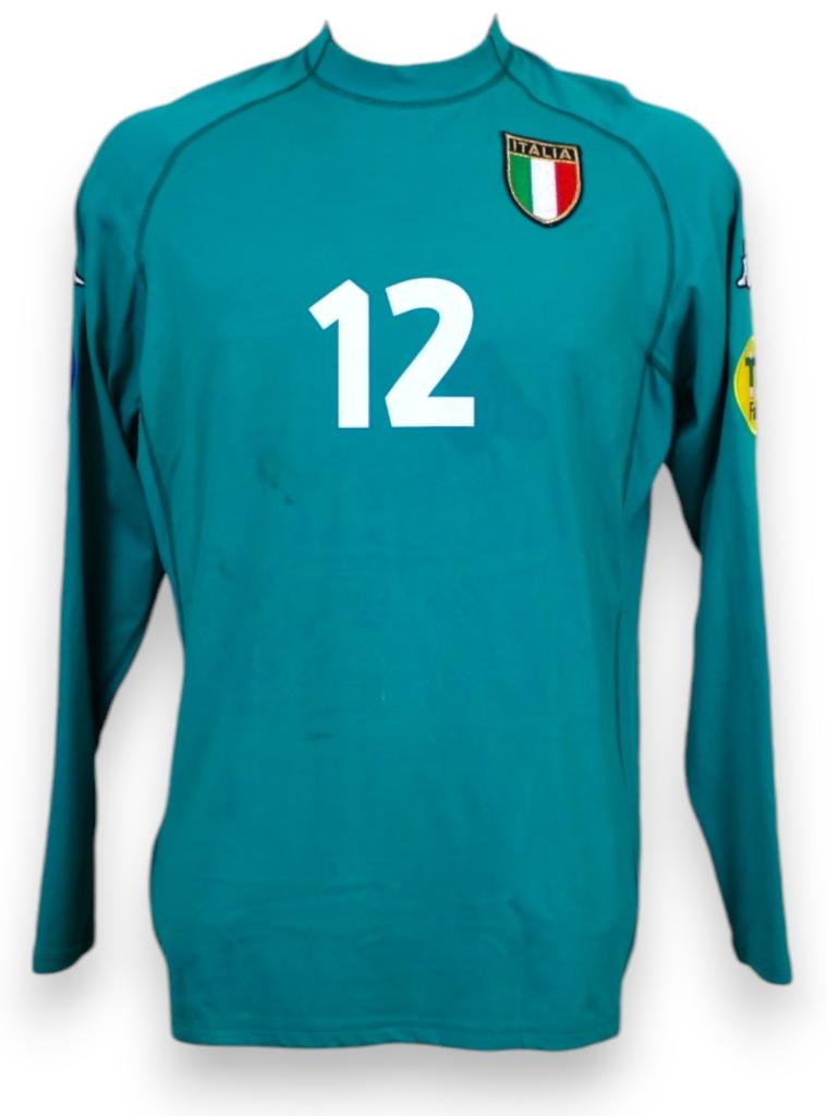 Versione player issued a manica lunga prodotta da Kappa, di colore verde acqua, con numero 12 applicato frontalmente. Sul retro sono presenti il nome “ABBIATI”, il numero 12 e una dedica autografa: “Ai gemelli, EUROPA 2000, era poco ma ve l’avevo promesso!”. Sulle maniche sono cucite le patch originali UEFA: “Fair Play” e “EURO 2000”.