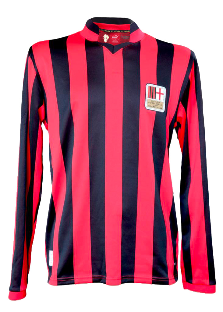 Maglia celebrativa ufficiale AC Milan per i 125 anni, stagione 2024, versione store. Prodotta da Puma, riprende lo storico design a strisce verticali rossonere del Milan Football & Cricket Club, con colletto vintage e lo stemma commemorativo dorato "1899-2024" sul petto.