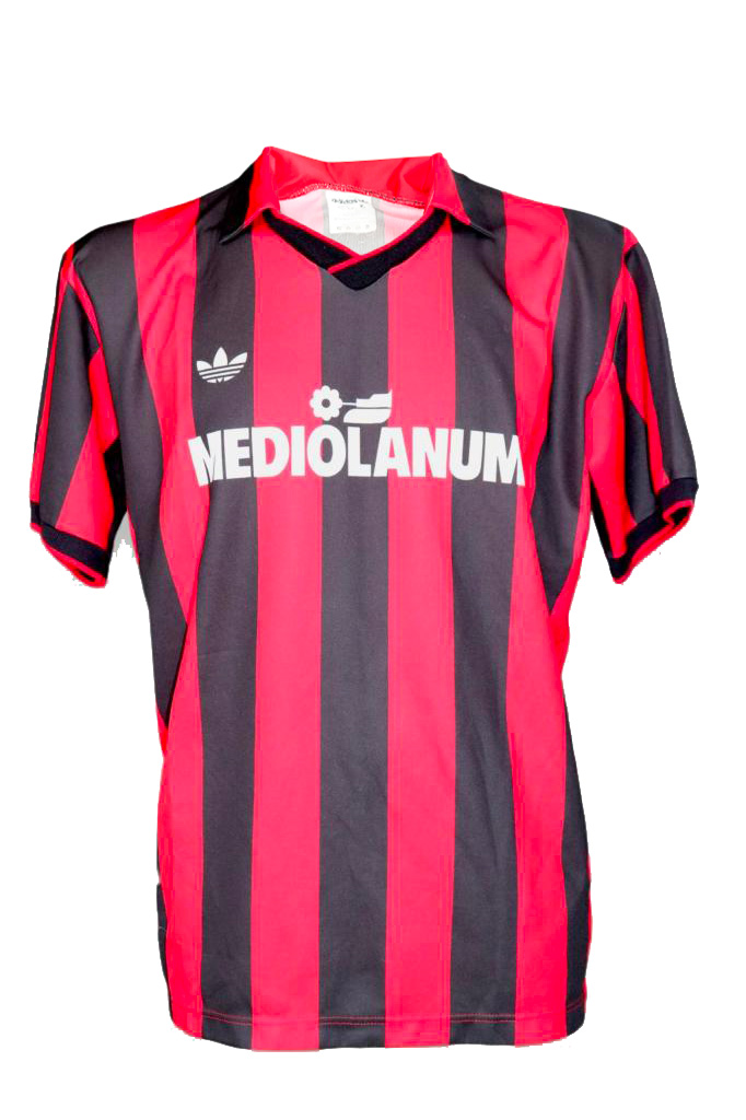 Maglia ufficiale AC Milan stagione 1988-1989, versione store. Modello prodotto da Adidas con iconico design a strisce verticali rossonere, sponsor Mediolanum frontale e logo Adidas a sinistra. Sul retro presente il numero 11, con l’autografo di Daniele Massaro.