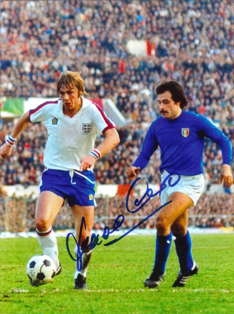 Fotografia autografata di Franco Causio in maglia azzurra, scatto storico Italia-Inghilterra negli anni ’70.