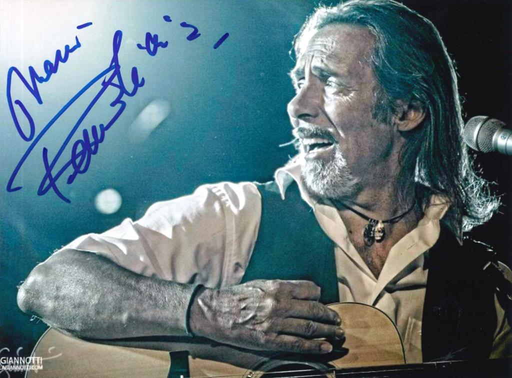 Fotografia a colori con autografo di Marco Ferradini, cantautore italiano celebre dagli anni ’80. L’immagine lo ritrae durante un concerto, con chitarra acustica tra le mani e microfono sullo sfondo, in un momento di intensa interpretazione dal vivo. L’autografo, apposto con pennarello blu, è collocato nella parte superiore sinistra della fotografia e accompagnato da una dedica personalizzata. Lo scatto restituisce l’energia e il carisma dell’artista sul palco, unendo immagine e firma autentica.