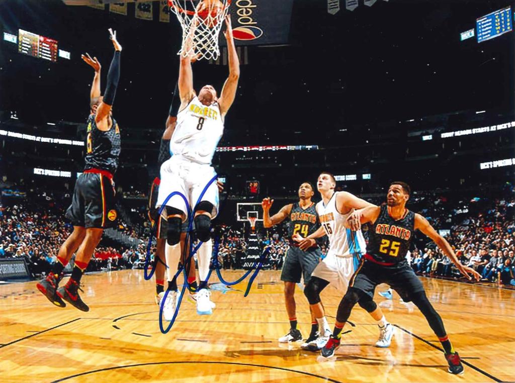 Fotografia a colori con autografo di Danilo Gallinari, cestista italiano tra i più rappresentativi della sua generazione. L’immagine lo ritrae in maglia bianca numero 8 dei Denver Nuggets mentre realizza una schiacciata a canestro, contrastato dai difensori degli Atlanta Hawks. L’autografo, apposto con pennarello blu, è collocato nella parte inferiore centrale della fotografia, ben visibile in corrispondenza del corpo del giocatore. Uno scatto che immortala la forza e lo stile del campione italiano nella massima lega mondiale di pallacanestro.