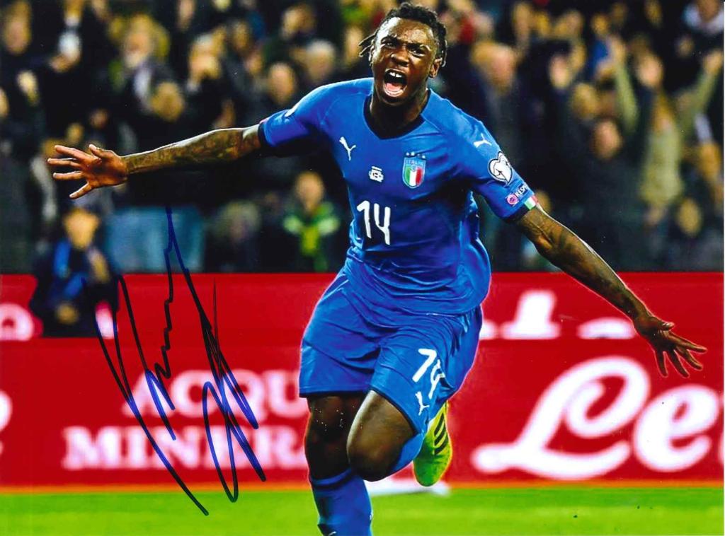Fotografia autografata di Moise Kean con la maglia azzurra, esultanza dopo il gol e firma autentica dell’attaccante della Nazionale.