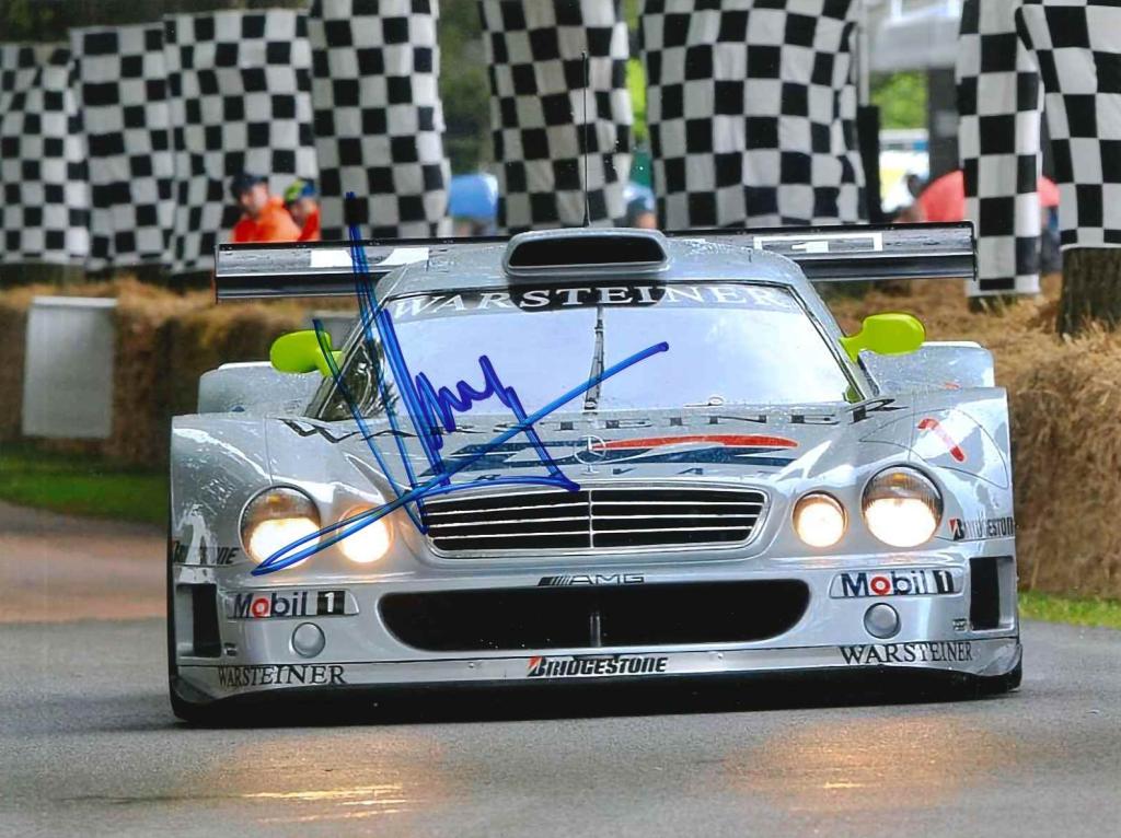Fotografia autografata di Klaus Ludwig su Mercedes AMG GT1, tre volte vincitore della 24 Ore di Le Mans e leggenda del DTM.