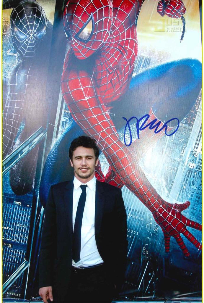 Fotografia a colori di ampio formato che ritrae James Franco elegante in giacca e cravatta durante la premiere di Spider-Man, posando davanti a un grande poster promozionale del celebre film Marvel. Sullo sfondo campeggiano le immagini iconiche dell’Uomo Ragno, che richiamano il ruolo di Harry Osborn interpretato da Franco nella trilogia diretta da Sam Raimi. L’autografo, tracciato con pennarello blu, è ben visibile sulla parte centrale del supporto.