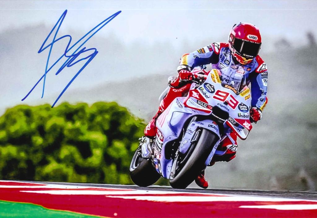 Fotografia a colori che immortala Marc Márquez, uno dei piloti più vincenti della MotoGP, mentre affronta una curva in sella alla Ducati numero 93. L’immagine coglie l’intensità della gara, con il campione spagnolo proteso in piega estrema e la moto carica di sponsor ben visibili. In alto a sinistra campeggia l’autografo originale di Márquez, realizzato in pennarello blu, che risalta con forza sullo sfondo. La fotografia rappresenta un autentico frammento della carriera del pilota catalano, simbolo di grinta e talento assoluto nelle due ruote.