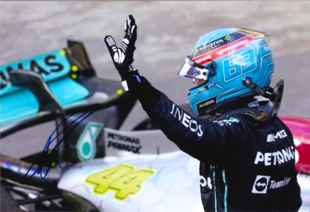 Fotografia a colori che immortala George Russell, pilota della Mercedes-AMG Petronas, mentre saluta con il braccio alzato a bordo pista. Indossa la tuta da gara nera con gli sponsor in evidenza e il casco azzurro personalizzato con il numero 63 ben visibile. Alle sue spalle si distingue il dettaglio della monoposto Mercedes, con il numero 44 in primo piano sull’ala, a testimonianza della scena in pieno contesto di Formula 1. L’autografo originale di Russell è apposto in pennarello blu sul lato sinistro della foto, ben evidente e autentico.