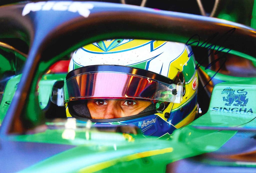 Fotografia autografata di Gabriel Bortoleto, primo piano nell’abitacolo della monoposto.