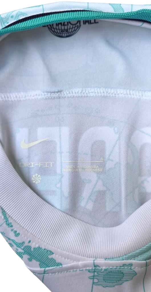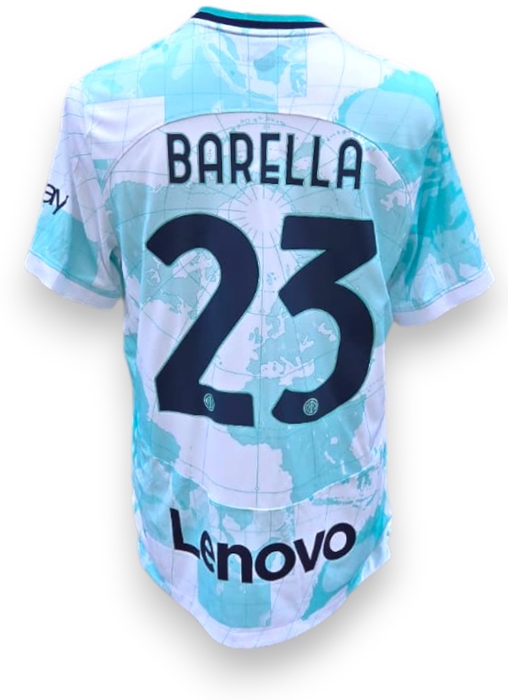 Maglia Inter Away versione Store 2022-23 con personalizzazione Barella 23, modello ufficiale Nike. Il fronte è caratterizzato da un motivo globale con stampa mappamondo in tonalità “verde acqua” su base bianca, con lo stemma nerazzurro e lo swoosh in contrasto. Il colletto ospita la dicitura “Milano 1908”.