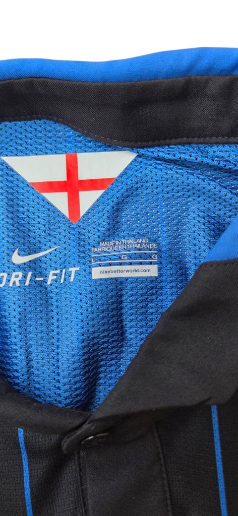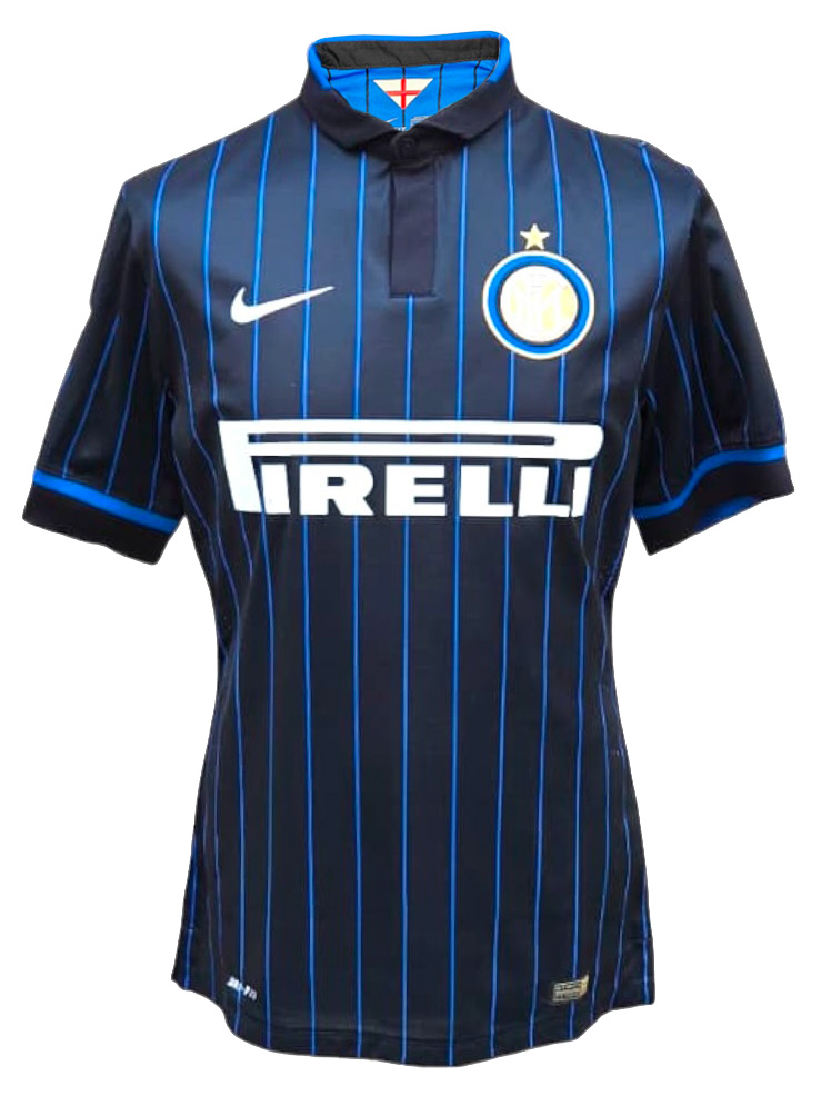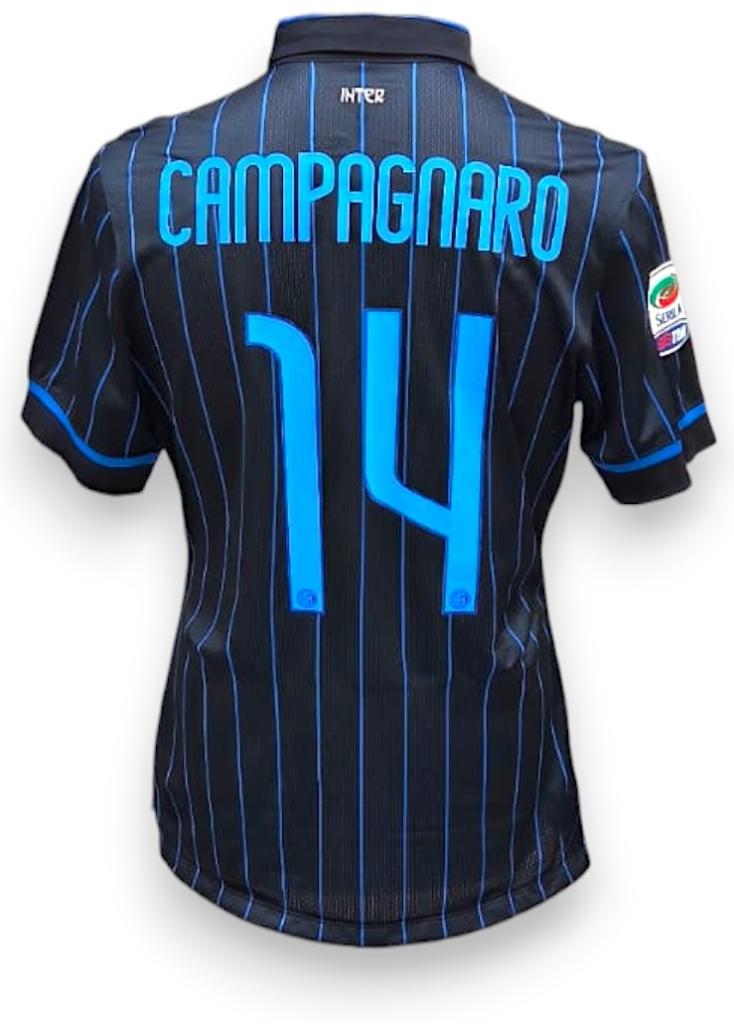Maglia Inter Home versione Player Issued della stagione 2014/15 con personalizzazione Campagnaro 14, modello ufficiale Nike. Petto con logo Nike bianco e sponsorizzazione Pirelli. Il colletto è a polo, tipico delle divise da quell’epoca.