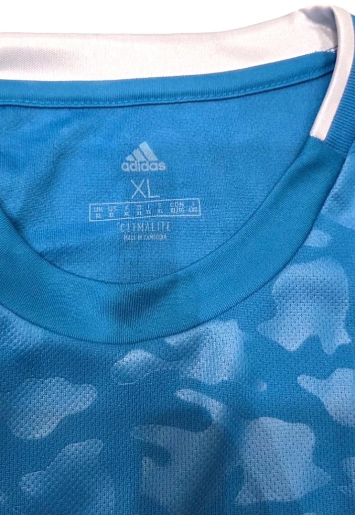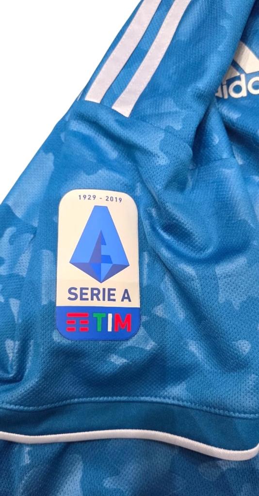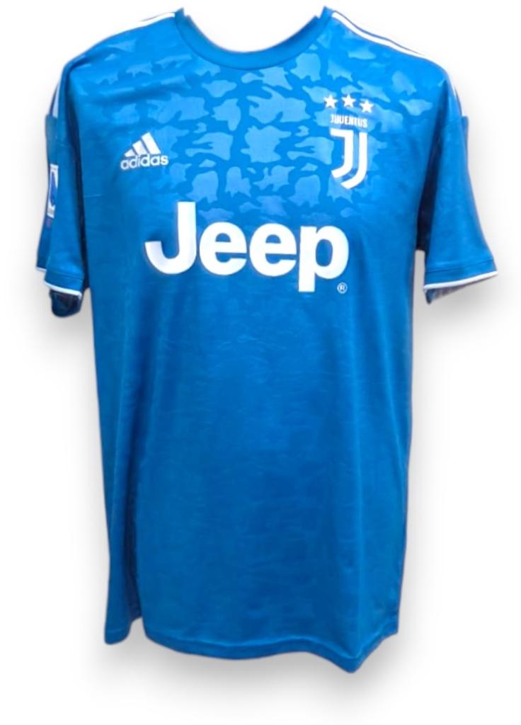 Maglia Juventus Third 2019/20 versione Store con personalizzazione Ronaldo 7, modello ufficiale Adidas nella colorazione blu-azzurra. Il tessuto ha un effetto “camouflage liquido” tono su tono, con pattern grafico astratto su tutta la superficie. Sul petto spiccano lo stemma Juventus con le tre stelle sopra, il logo Adidas e lo sponsor Jeep in bianco. Sulla manica è presente la tach ufficiale della Serie A. Le spalle hanno le tre strisce Adidas in contrasto chiaro. Il colletto è girocollo semplice e all’interno è riportata la taglia XL.