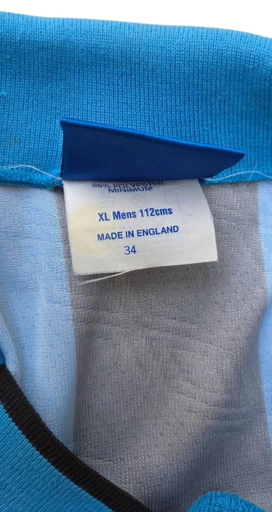 L’etichetta mostra “XL” e materiale in “85 % Polyester / Made in England”.