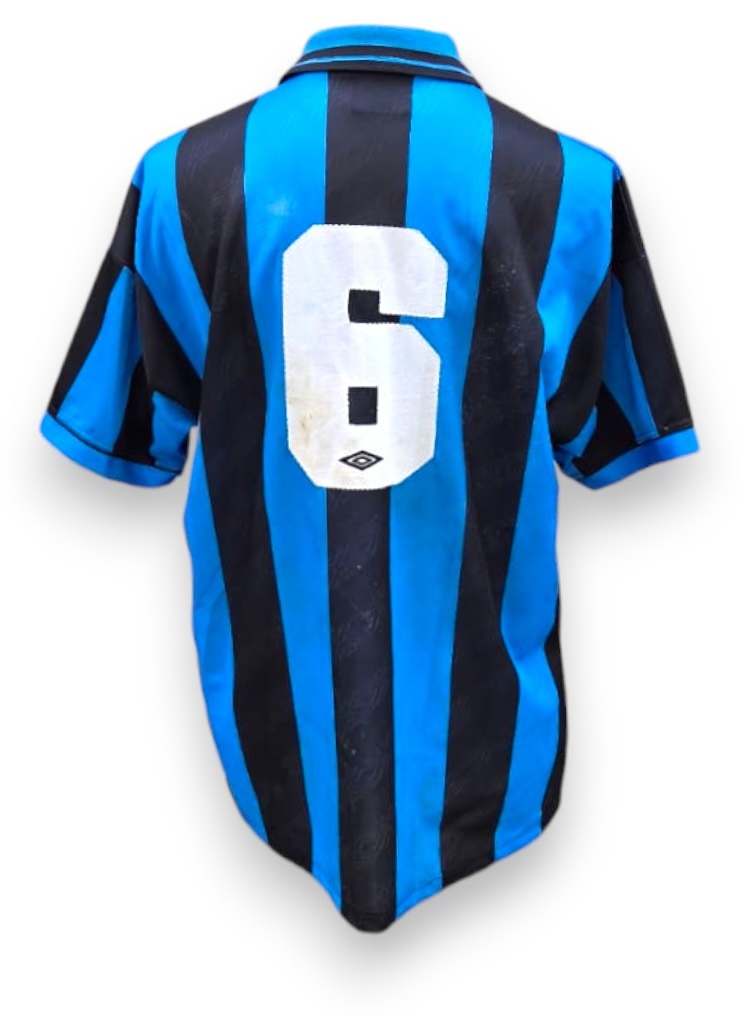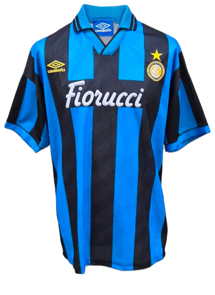 Maglia Inter Umbro e sponsor Fiorucci, con righe verticali nero-azzurre e colletto a polo. Maglia player issued con sul retro il numero 6.