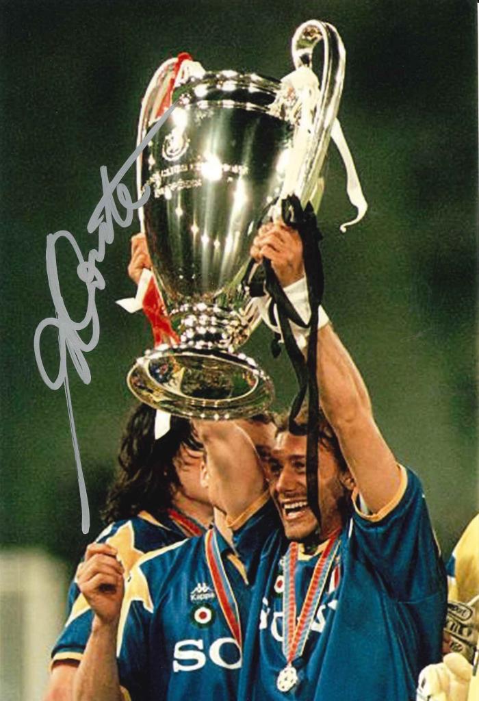 Fotografia autografata che raffigura Antonio Conte mentre solleva il trofeo della Champions League 1996 con la maglia della Juventus, al termine della finale di Roma contro l’Ajax. La firma originale in pennarello chiaro è ben visibile sulla parte sinistra dell’immagine. Lo scatto immortala un momento celebrativo, con il trofeo ben in evidenza e il volto esultante di Conte.