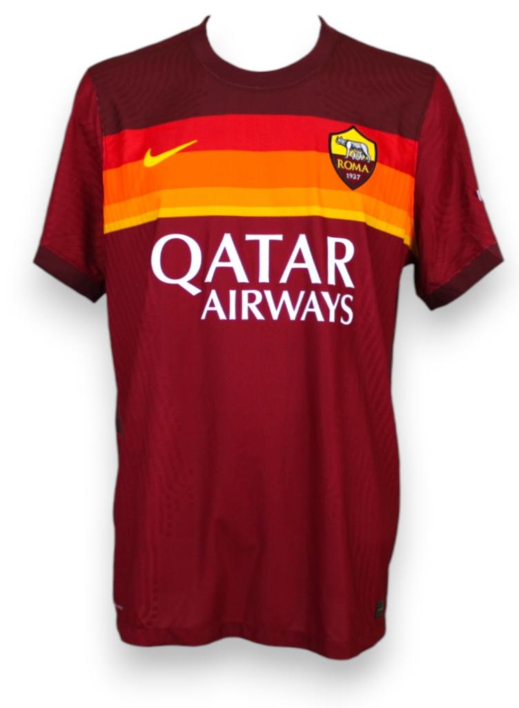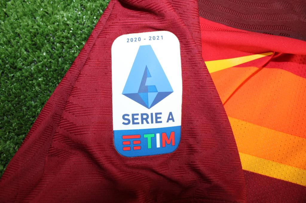 Maglia AS Roma home 2020-21 versione store authentic con personalizzazione Kumbulla 24, patch Serie A sulla manica.