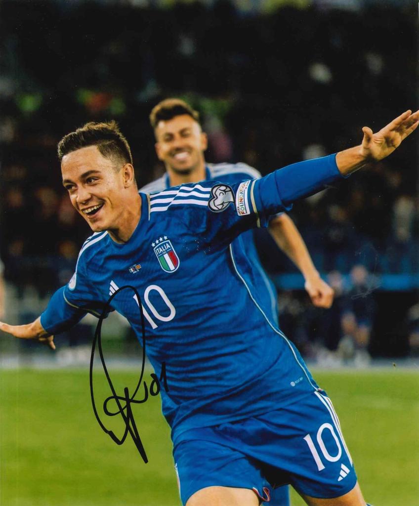 Fotografia autografata di Giacomo Raspadori con la maglia azzurra, in celebrazione, con firma ben visibile.