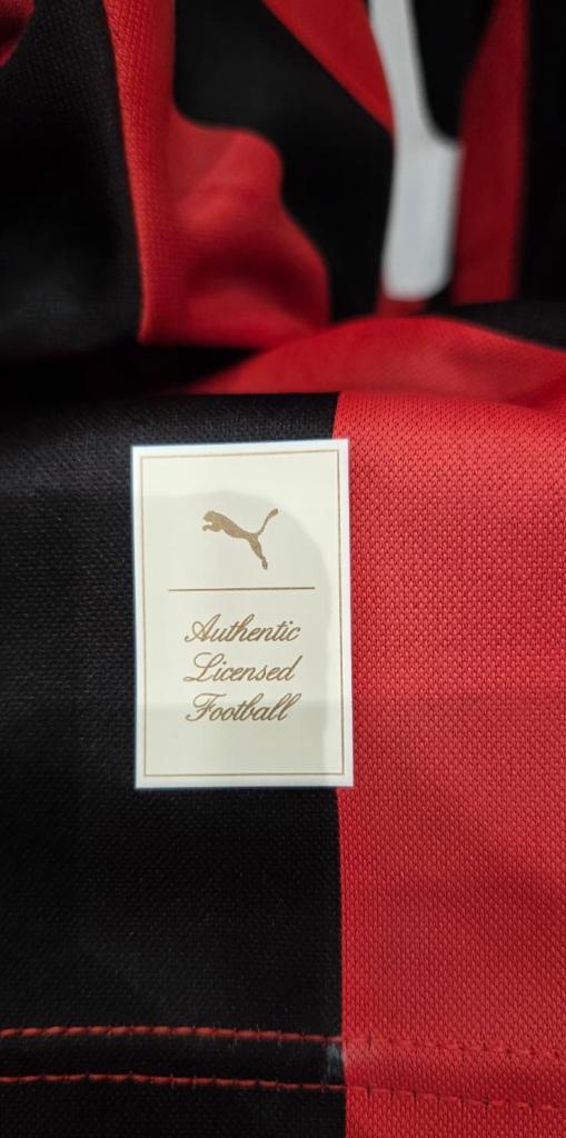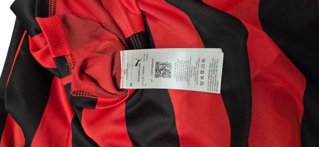 Non sono presenti loghi di sponsor sul fronte (in accordo con le caratteristiche della maglia anniversary, che non include sponsor esterni). Il marchio tecnico Puma è visibile, e l’etichetta interna recita “Made in Vietnam” con le indicazioni di lavaggio in poliestere. Le maniche lunghe conferiscono un aspetto classico e robusto, adatto sia a un uso da campo che da collezione. Sul retro, si nota il numero stampato “6” in bianco su sfondo rosso/nero.
