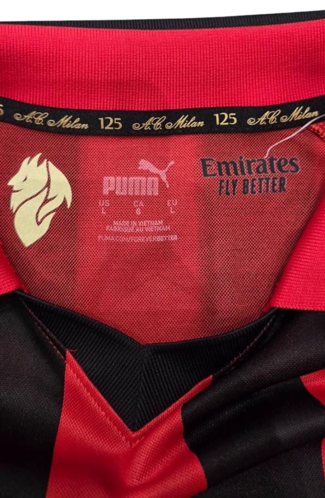 Questa divisa celebra i 125 anni del club AC Milan e mostra chiaramente elementi distintivi: le strisce rosse e nere sono di larghezza uniforme e in stile retrò. Il colletto è ben definito con inserti in rosso e nero che richiamano i colori sociali. Nell’interno del colletto si nota la scritta “A.C. Milan 125” come dettaglio commemorativo.