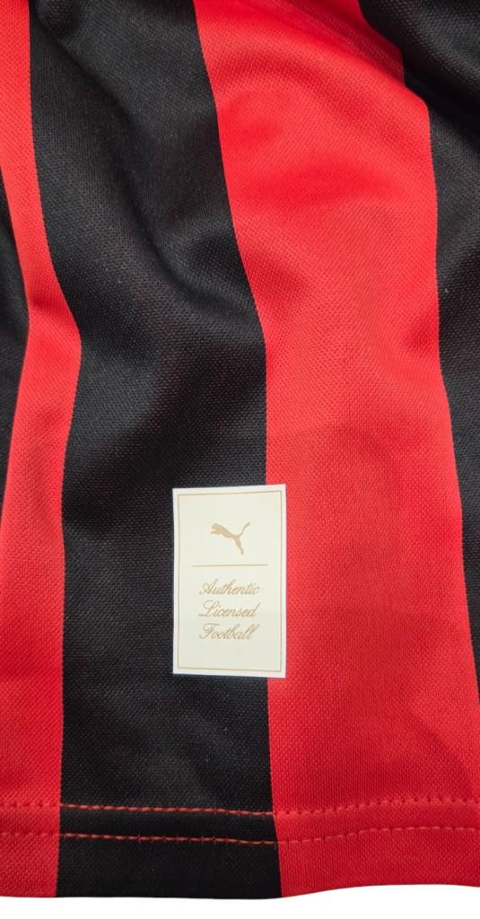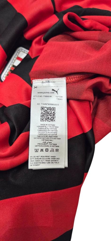 Non sono presenti loghi di sponsor sul fronte (in accordo con le caratteristiche della maglia anniversary, che non include sponsor esterni). Il marchio tecnico Puma è visibile, e l’etichetta interna recita “Made in Vietnam” con le indicazioni di lavaggio in poliestere. Le maniche lunghe conferiscono un aspetto classico e robusto, adatto sia a un uso da campo che da collezione. Sul retro, si nota il numero stampato “9” in bianco su sfondo rosso/nero.