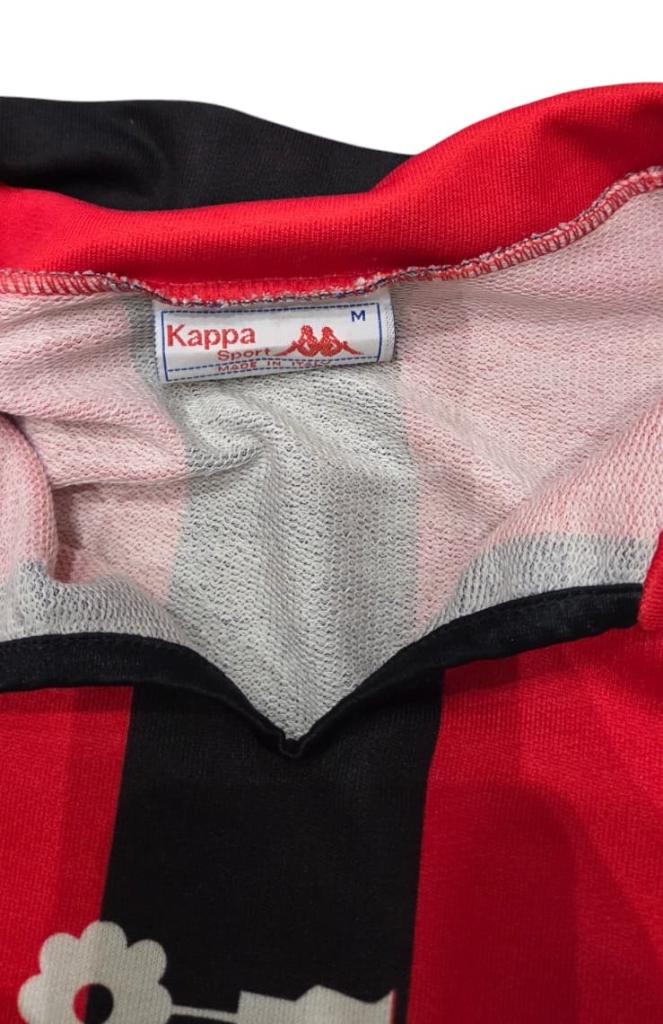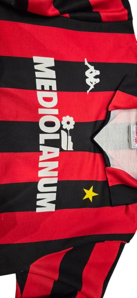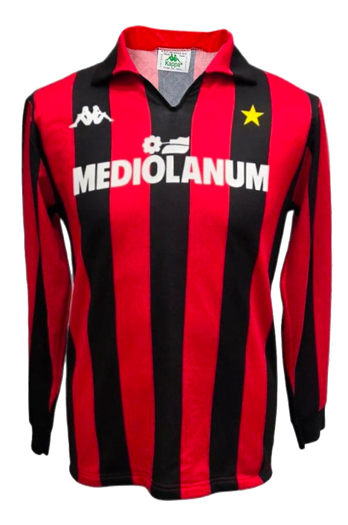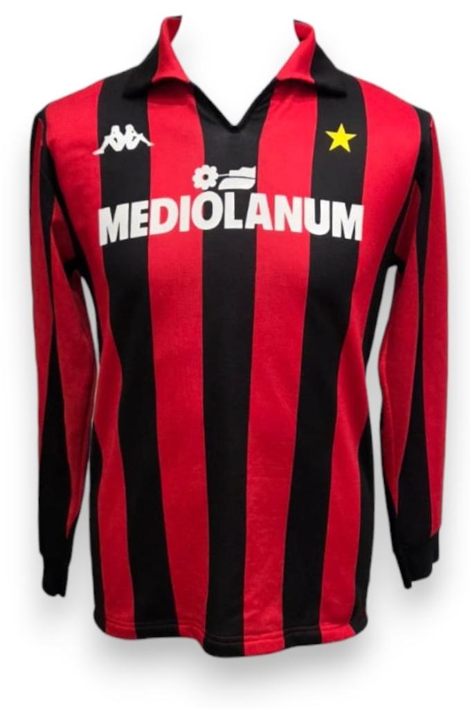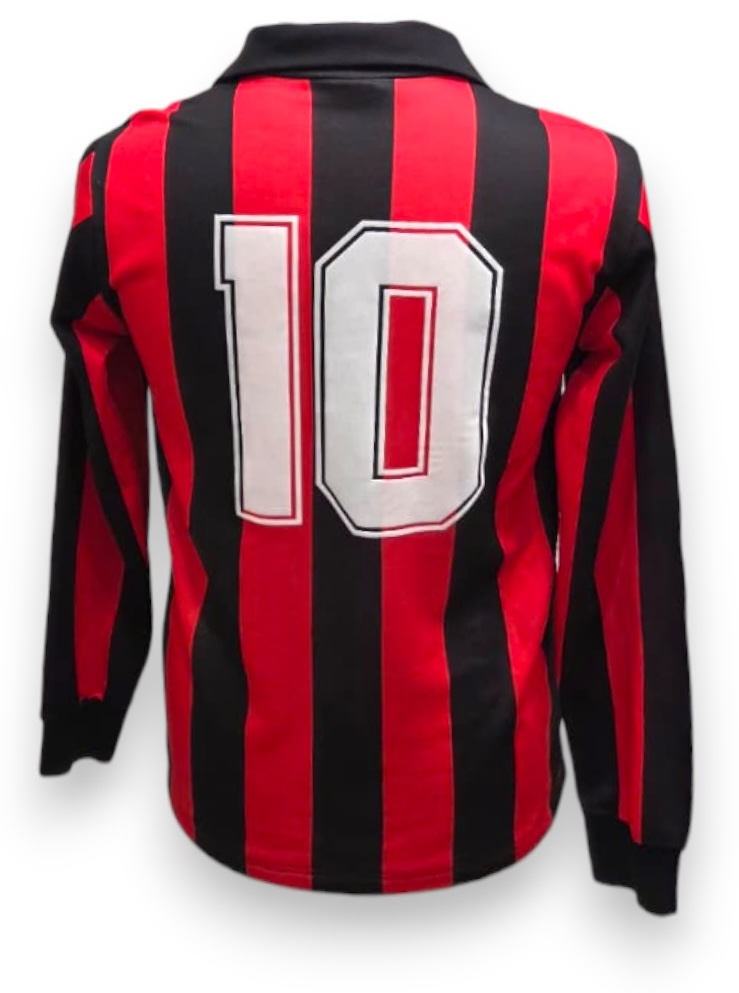 Maglia Home Milan 1989/90 a bande verticali rosse e nere, con sponsor Mediolanum, manica lunga, personalizzata con n° 10 sul retro in bianco