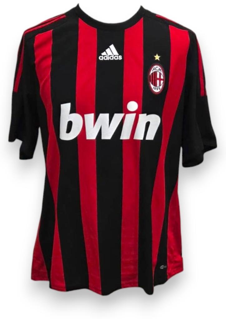 Maglia Home del Milan stagione 2007/08, prodotta da Adidas, con il classico design rossonero a strisce verticali nere e rosse e colletto a girocollo in rosso e nero. Lo sponsor tecnico Adidas è applicato al centro del petto in bianco sopra lo sponsor commerciale Bwin, mentre sul cuore è cucito lo stemma societario con stella celebrativa del decimo scudetto.