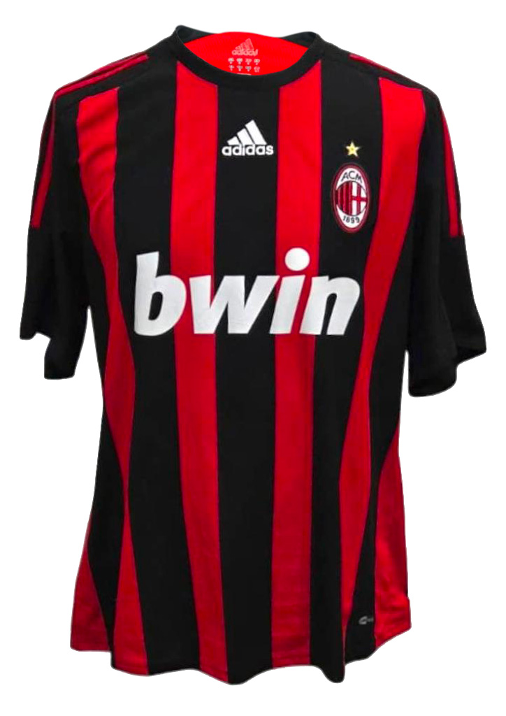 Maglia Home del Milan stagione 2008/09, prodotta da Adidas, con il classico design rossonero a strisce verticali nere e rosse e colletto a girocollo in rosso e nero. Lo sponsor tecnico Adidas è applicato al centro del petto in bianco sopra lo sponsor commerciale Bwin, mentre sul cuore è cucito lo stemma societario con stella celebrativa del decimo scudetto.