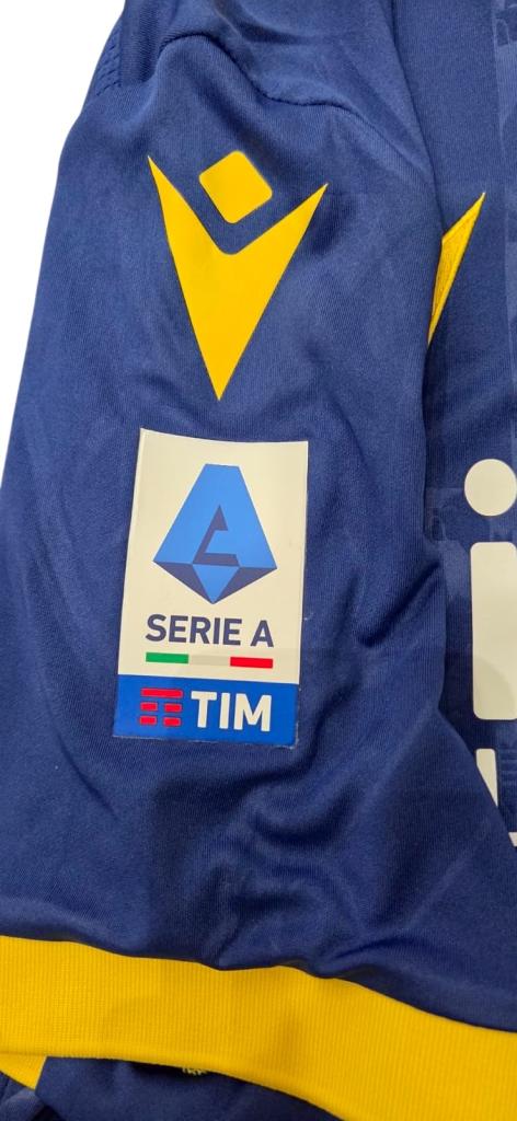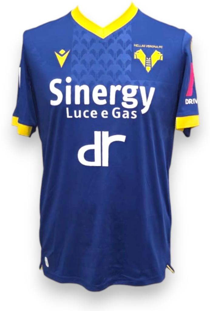 Maglia Home dell’Hellas Verona per la stagione 2021/2022, realizzata da Macron, versione player issued. La divisa è caratterizzata dal classico colore blu intenso con dettagli gialli su colletto a V e bordo maniche, in piena coerenza con la tradizione cromatica del club. Sul petto è presente lo stemma dell’Hellas Verona FC ricamato, accompagnato dal logo Macron e dallo sponsor principale Sinergy Luce e Gas, mentre al centro spicca lo sponsor secondario dr Automobili. Sul retro appare lo sponsor Vetrocar.