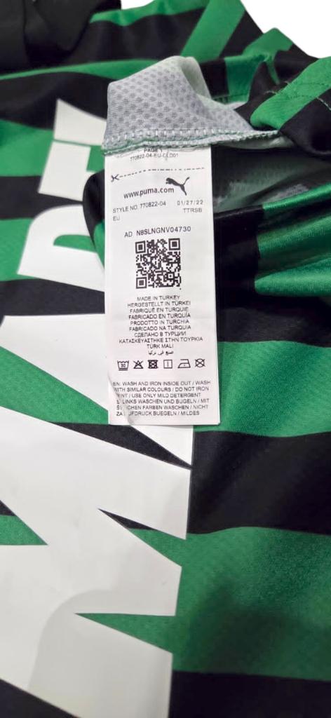 La maglia è una versione Store, come confermato dal taglio della taglia Puma in lettere (M), ed è prodotta in Turchia. Tessuto tecnico leggero e traspirante, pensato per garantire comfort e libertà di movimento. Un pezzo legato a una delle stagioni di crescita della squadra neroverde, quando Frattesi si impose come uno dei giovani più promettenti del campionato.