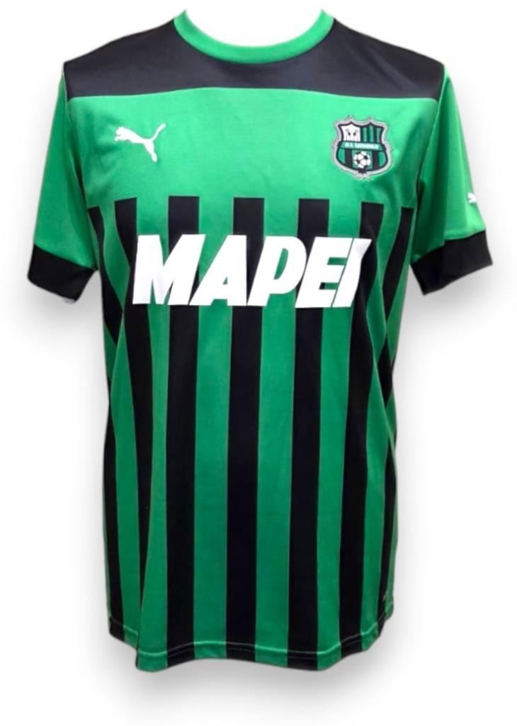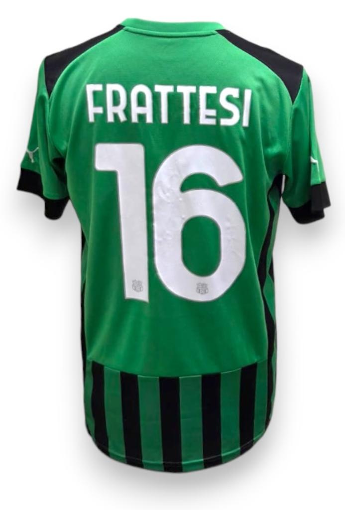 Maglia home del Sassuolo indossata nella stagione 2021/22, realizzata dallo sponsor tecnico Puma. La divisa si presenta nella classica combinazione cromatica neroverde, con base verde e strisce verticali nere che scendono lungo il fronte, interrotte da una fascia nera piena sulle spalle e sul petto. Sul lato sinistro è cucito lo stemma societario, mentre sul lato destro è applicato il logo Puma. Al centro della maglia campeggia lo storico sponsor commerciale “Mapei” in bianco. La versione è a manica corta con scollo tondo verde, dettagli che mantengono lo stile semplice e tradizionale della squadra emiliana. Sul retro sono applicati nome e numero del centrocampista Davide Frattesi, con il numero 16 in bianco e lo stemma del club inserito all’interno della numerazione.