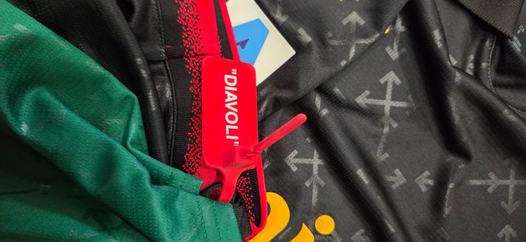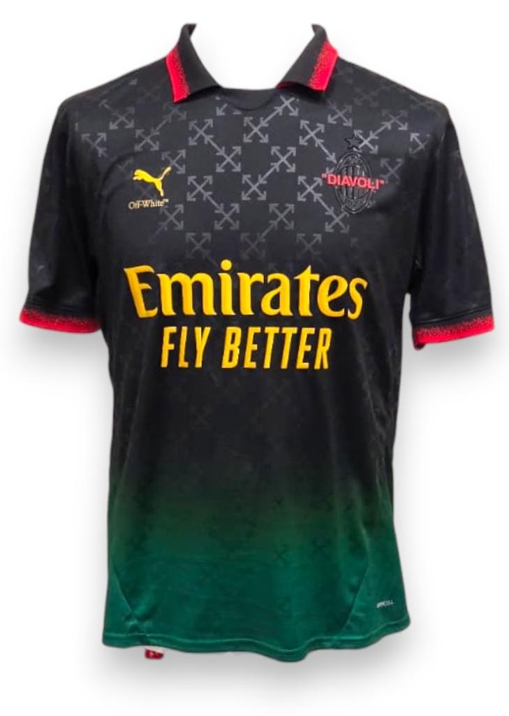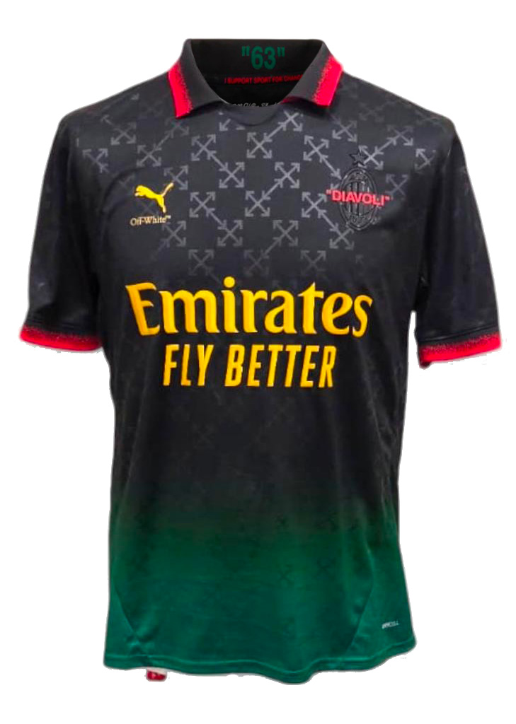 La maglia speciale dell’AC Milan per la stagione 2025 rappresenta una delle collaborazioni più iconiche tra Puma e Off-White, unendo design contemporaneo e tradizione rossonera. La divisa presenta una base nera con sfumature verdi nella parte inferiore, arricchita dal pattern grafico Off-White tono su tono e dettagli rossi su colletto e maniche, con finiture ispirate alla cultura streetwear. Lo sponsor Emirates Fly Better e i loghi Puma e Off-White sono realizzati in giallo a contrasto, mentre sul retro compare il nome “GIMENEZ” e il numero 7 in stampa ufficiale gialla.