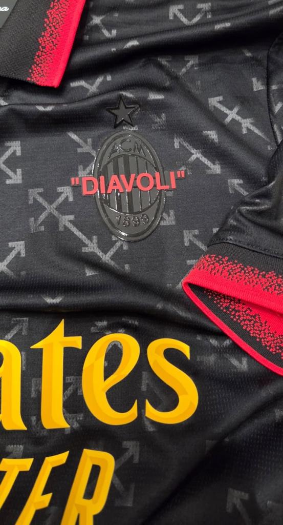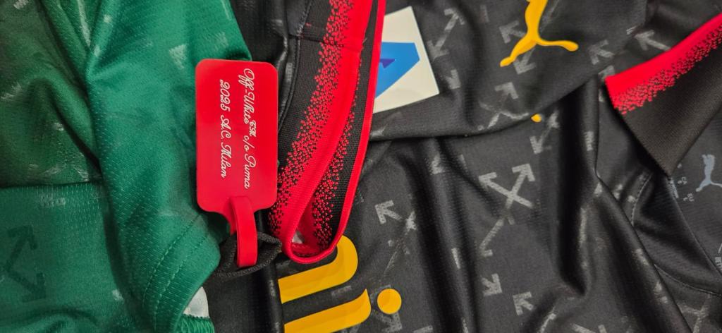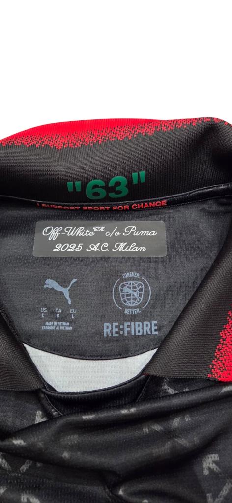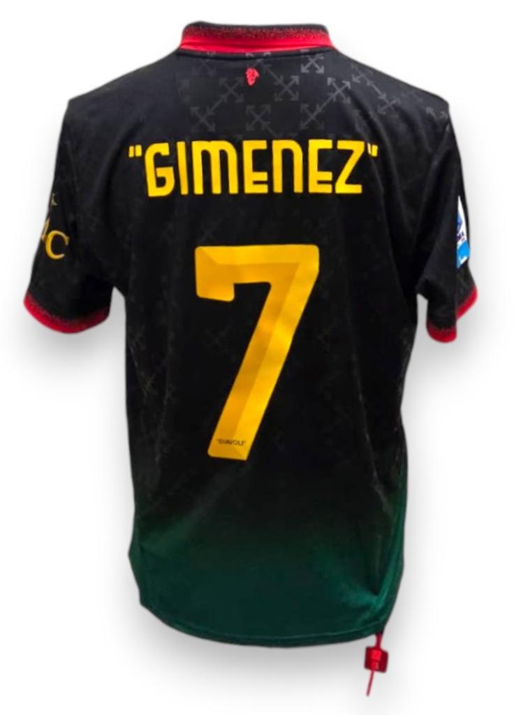 Maglia speciale dell’AC Milan 2025, realizzata in collaborazione con Off-White e Puma. Versione store personalizzata con Gimenez 7.