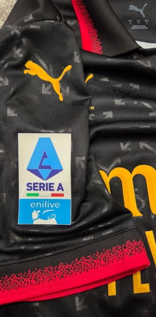 Sul petto è presente il logo AC Milan con la scritta “DIAVOLI”, mentre sulla manica spicca la patch Serie A TIM 2024-25 con sponsor Enilive. L’interno del colletto riporta il numero “63” e il messaggio “I Support Sport for Change”, simbolo dell’iniziativa sociale legata al progetto.