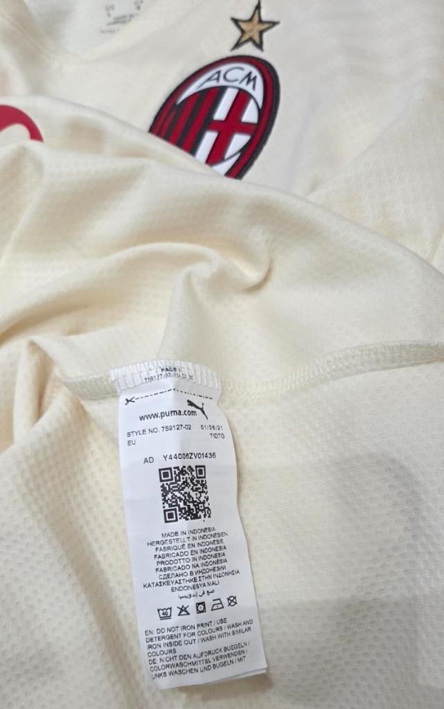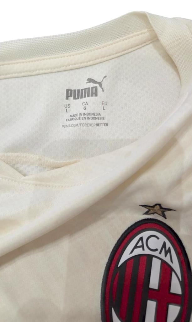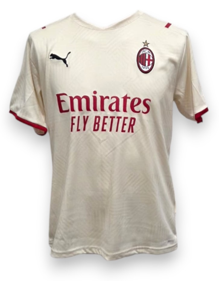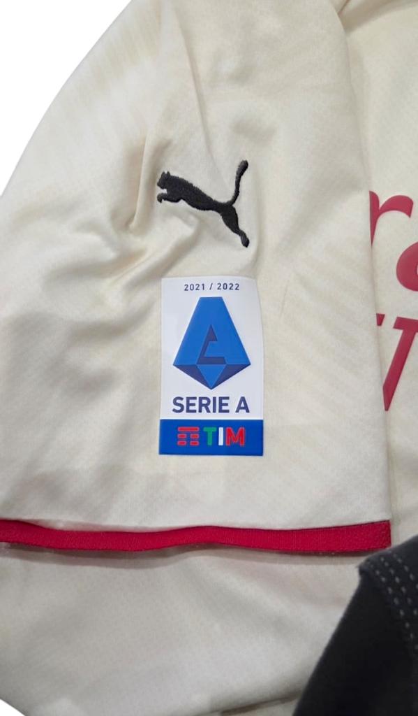 La maglia Away dell’AC Milan per la stagione 2021/22, prodotta da Puma, si distingue per la tonalità panna elegante arricchita da inserti rossi su colletto e maniche, con un design pulito e moderno che esalta la tradizione rossonera. Sul fronte spiccano lo stemma ricamato del club con stella dorata, il logo Puma e lo sponsor principale Emirates Fly Better. La patch ufficiale della Serie A TIM 2021/22 è applicata sulla manica. Il retro presenta il name set ufficiale “Giroud” con numero 9, in rosso con texture nera personalizzata con il logo ACM. Realizzata in tessuto tecnico traspirante, è la versione Store, pensata per i tifosi e per un uso quotidiano.