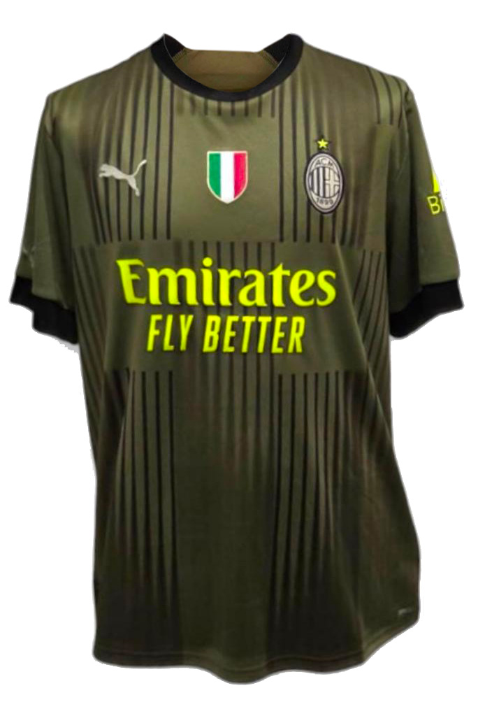 Maglia verde dell’AC Milan utilizzata nella stagione 2022/23, prodotta dallo sponsor tecnico Puma nella versione Store. Il modello si presenta in color verde con dettagli neri, caratterizzato dal logo Puma e dallo stemma ricamato del club rossonero. Sul petto campeggia lo sponsor principale Emirates Fly Better in giallo. Sul retro troviamo il nome e numero 9 di Olivier Giroud con stampa ufficiale, accompagnati dallo sponsor Wefox sotto il numero.