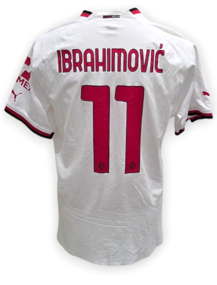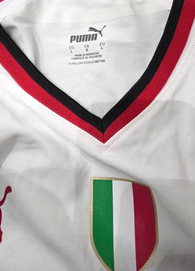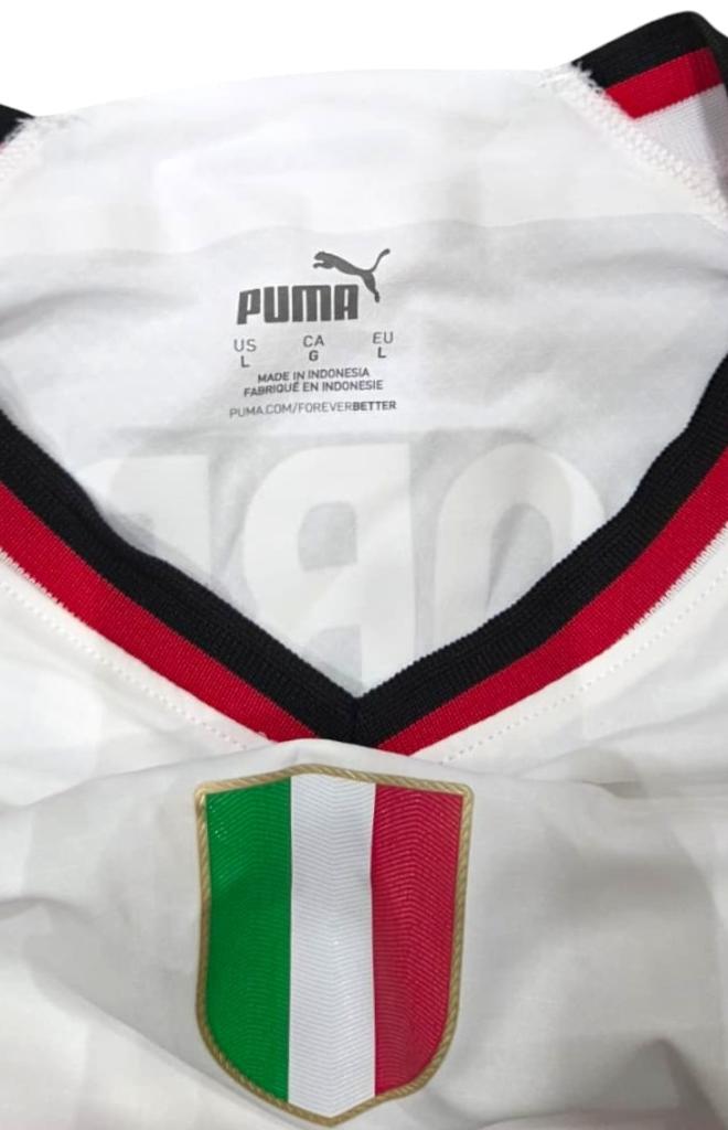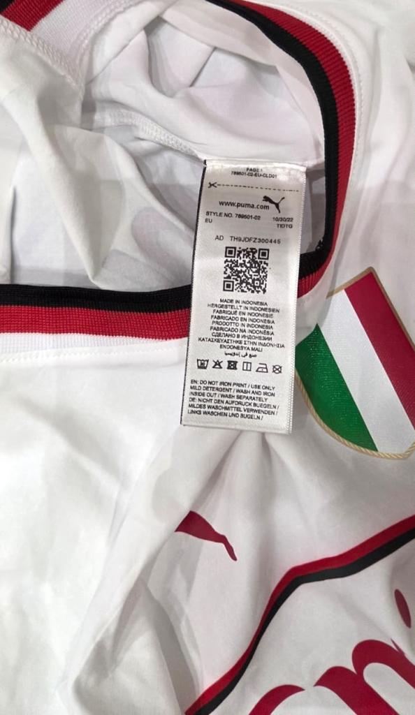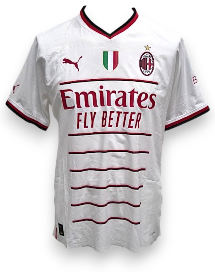 Maglia away AC Milan della stagione 2022/23 prodotta da Puma, versione store. Il modello è caratterizzato da una base bianca con inserti e dettagli in rosso scuro su colletto e bordo maniche. Sul petto spiccano lo stemma del Milan cucito con stella celebrativa, lo Scudetto tricolore al centro in segno del titolo vinto, e il logo Puma ricamato. Sponsor commerciale Emirates Fly Better stampato sul fronte in rosso, mentre sul retro compaiono il main sponsor Wefox e la personalizzazione ufficiale Giroud 9.