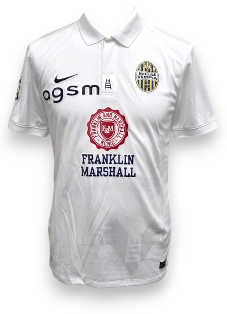 Maglia away Hellas Verona stagione 2014/15, realizzata da Nike personalizzata con Lazaros 20. Sulla manica è applicata la patch Serie A.