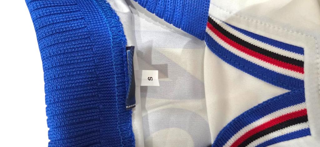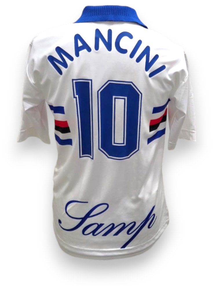Maglia da trasferta della Sampdoria indossata nella stagione 1995/96, realizzata da Asics in versione Store. Il modello è bianco con la tradizionale fascia orizzontale blucerchiata che attraversa il petto, al centro della quale è cucito lo stemma societario. Il colletto a polo blu con dettagli tricolori richiama lo stile tipico degli anni Novanta. Sul fronte spicca il logo Asics ricamato e il simbolo della Samp in blu, mentre sul retro è applicato il numero 10 con la personalizzazione "Mancini", oltre alla scritta "Samp" in corsivo verso il fondo. La maglia rappresenta uno dei pezzi più iconici del periodo doriano, legato alle ultime grandi stagioni del fantasista Roberto Mancini con la Sampdoria.