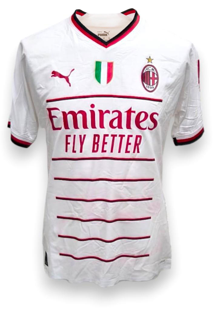 La maglia Away del Milan 2022/23 prodotta da Puma si distingue per il design elegante in bianco con dettagli rossoneri e una serie di sottili righe orizzontali rosse sul fronte, che richiamano la tradizione grafica del club. Sul petto trovano posto lo Scudetto tricolore, simbolo del titolo conquistato nella stagione precedente, lo stemma societario con stella celebrativa e lo sponsor tecnico Puma, mentre al centro campeggia la sponsorizzazione “Emirates Fly Better”. Sul retro compare la personalizzazione ufficiale Messias Jr 30, completata in basso dal secondo sponsor “Wefox”. La patch ufficiale della Serie A è applicata sulla manica.