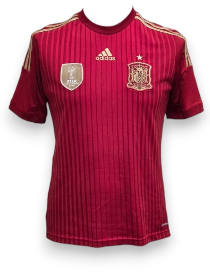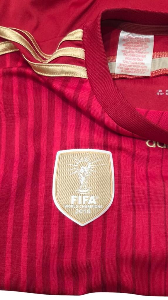 Maglia home JR della Spagna 2014 versione Store, con patch FIFA World Champions 2010 applicata sul petto.
