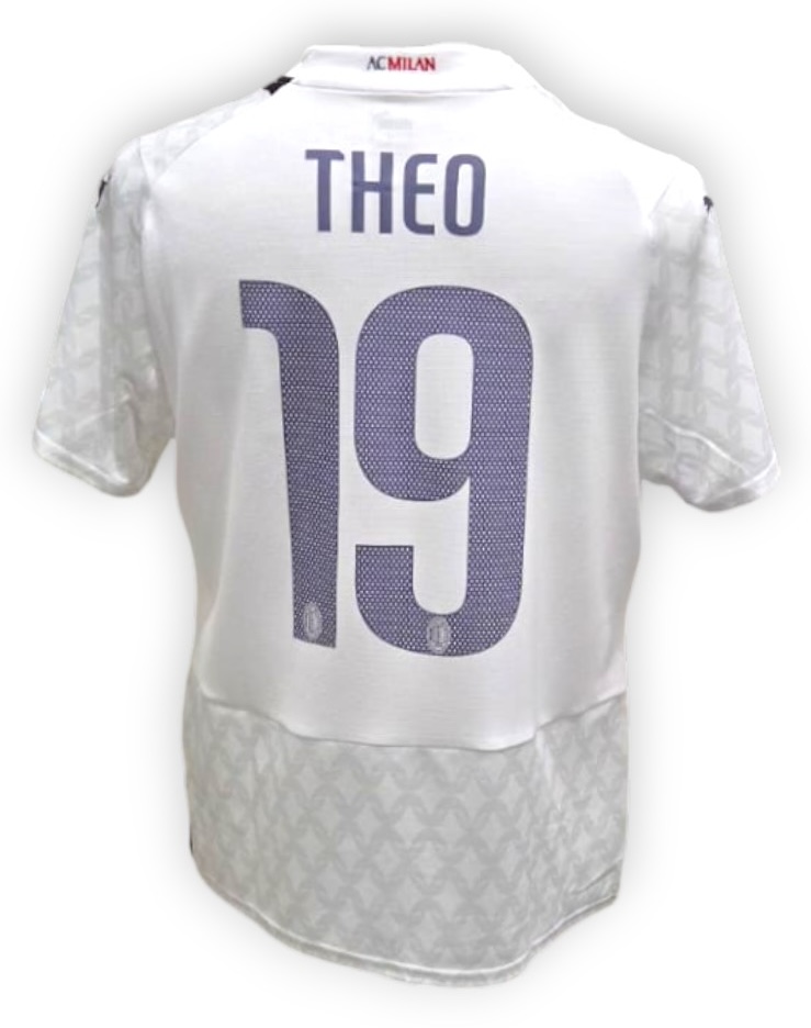 Maglia away dell’AC Milan 2023/24 bianca, realizzata da Puma con sponsor Emirates Fly Better. Personalizzata con nome e numero Theo 19.