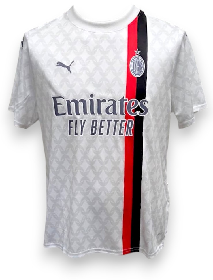 La maglia away dell’AC Milan per la stagione 2023/24, prodotta da Puma in versione Store, è caratterizzata da un elegante design bianco arricchito da una trama tono su tono che richiama le geometrie stilizzate del club. Sul lato sinistro campeggia una banda verticale divisa nei colori rossoneri, che incornicia lo stemma del club con stella celebrativa. Lo sponsor Emirates Fly Better domina la parte frontale, affiancato dal logo Puma sul petto.