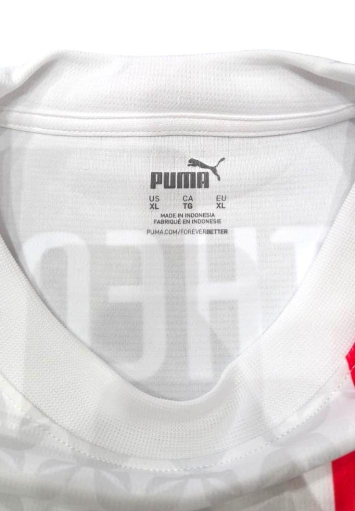 Il retro è personalizzato con il nome Theo e il numero 19 in stampa ufficiale, arricchita da microfori per migliorare la traspirazione. Sul colletto interno è presente la scritta “AC Milan” come dettaglio esclusivo. Lo sponsor tecnico Puma ha inserito la tecnologia che garantisce comfort e leggerezza. Una maglia che unisce tradizione e modernità, pensata per rappresentare il Milan anche lontano da San Siro.