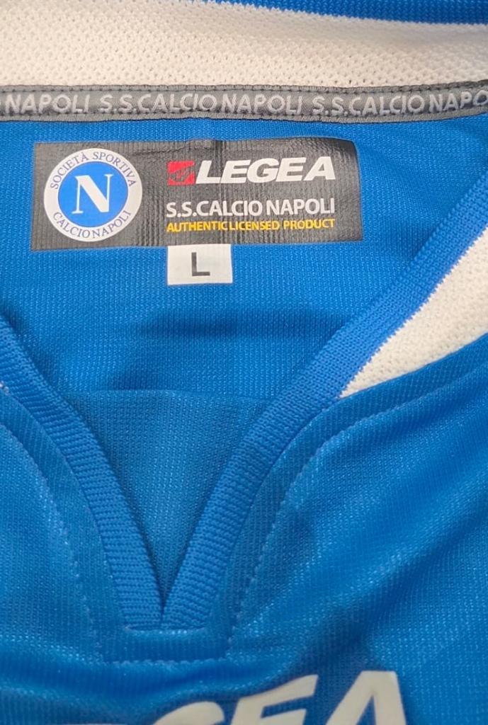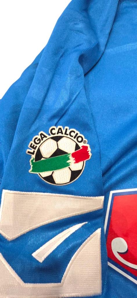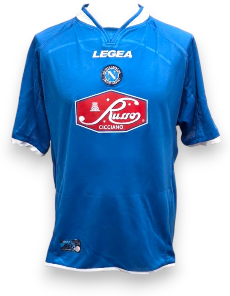 Maglia home del Napoli per la stagione 2003/04 realizzata dallo sponsor tecnico Legea, in una delle annate di transizione per il club partenopeo. Il modello è caratterizzato dal classico azzurro acceso, arricchito da dettagli bianchi su colletto e bordi manica. Sul fronte spiccano lo stemma societario ricamato, lo sponsor tecnico Legea e lo storico sponsor commerciale “Russo Cicciano”, che rimanda a un’epoca ben precisa della storia del club. Sulla manica destra è applicata la patch ufficiale della Lega Calcio Serie A, mentre sul retro sono presenti la personalizzazione “Tosto” e il numero 5 in stampa ufficiale.
