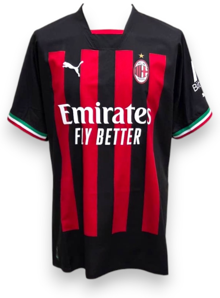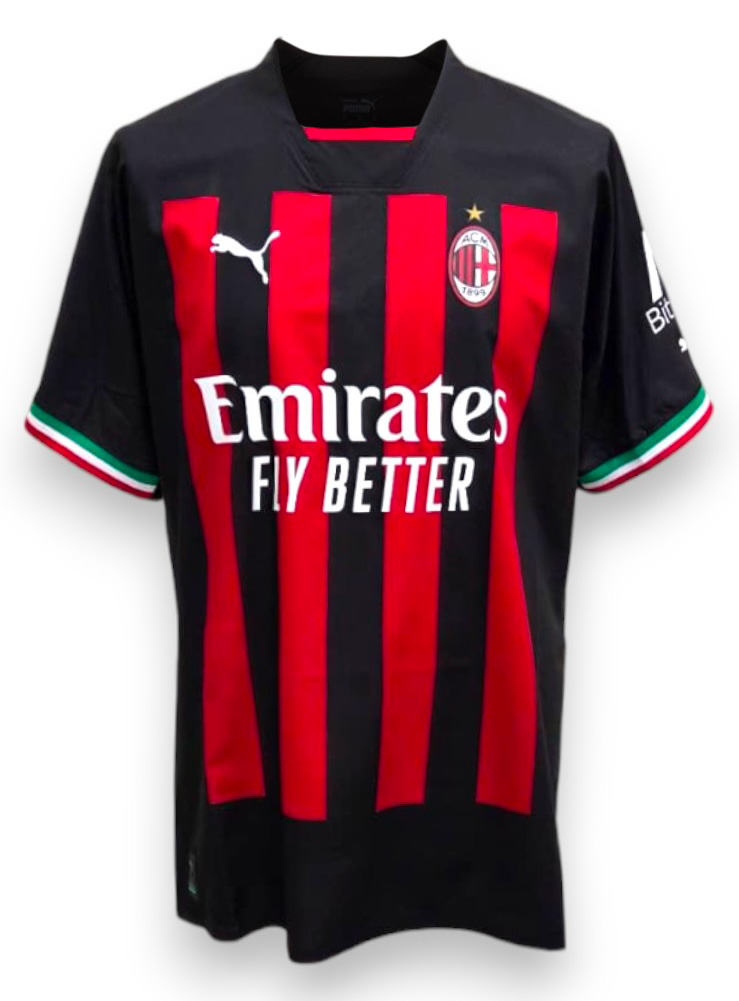 Maglia Milan Home 2022/23 versione Store, con strisce rossonere, dettagli tricolore sulle maniche e stemma del club ricamato sul petto.