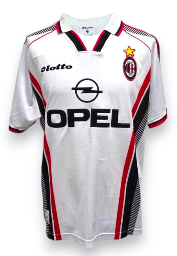 Maglia da trasferta dell’AC Milan per la stagione 1997/98, realizzata dallo sponsor tecnico Lotto. La divisa presenta la classica base bianca arricchita da dettagli grafici diagonali rossoneri e inserti neri a righe, con colletto a V rifinito nei colori sociali. Sul petto compaiono lo stemma societario con stella celebrativa, il logo Lotto ricamato e lo sponsor commerciale Opel in stampa centrale. Sul braccio destro è cucita la patch Lega Calcio in versione originale dell’epoca.