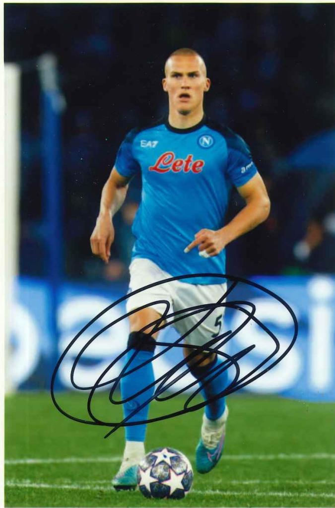 Autografo di Leo Ostigard in azione con il Napoli, firma nera ben visibile lungo il lato destro.
