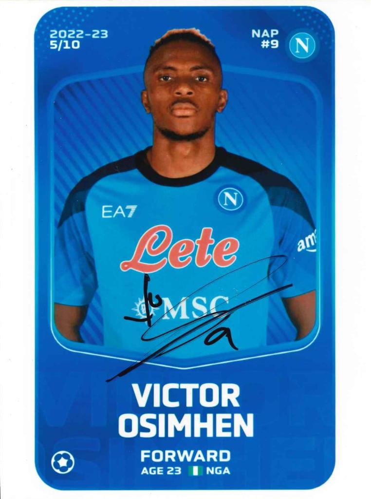 Autografo “card” di Osimhen: ritratto frontale col Napoli, edizione limitata, firma nera centrale.