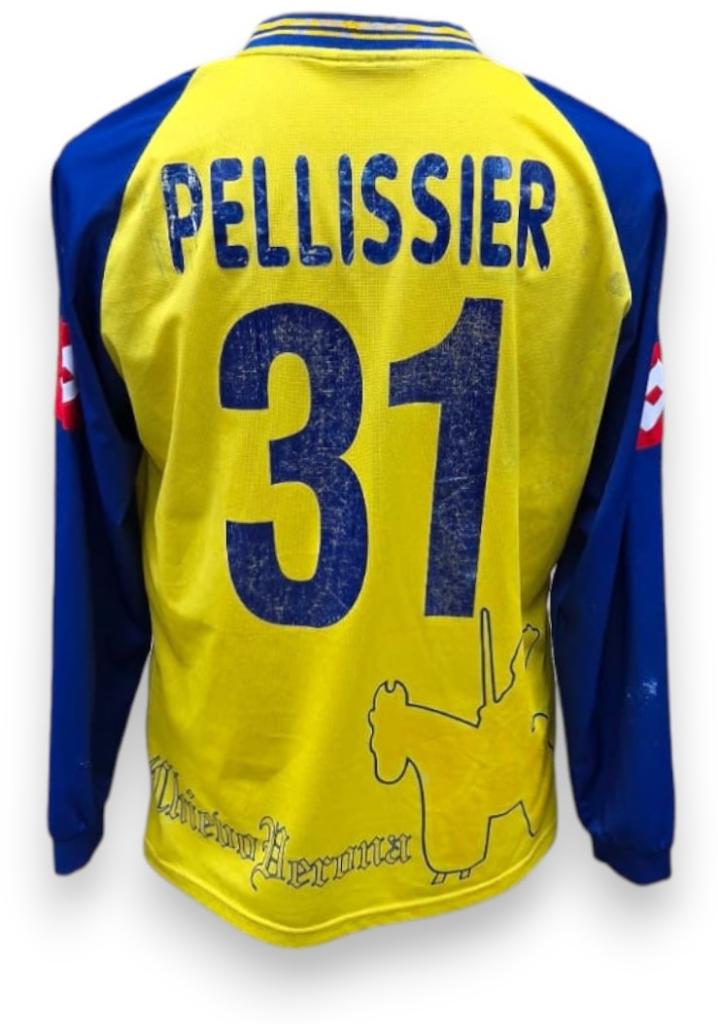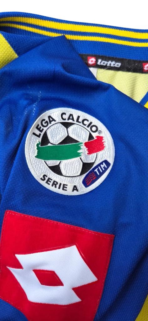 Sul retro sono applicati nome e numero Pellissier 31 in stampa ufficiale blu, segno distintivo dell’attaccante che sarebbe diventato una vera e propria bandiera del Chievo. Sulla manica compare la patch ricamata della Lega Calcio Serie A TIM, a certificare l’impiego in gare ufficiali della massima serie. La maglia è in versione Player Issued, con caratteristiche tecniche da campo come il tessuto traspirante a rete e una vestibilità aderente pensata per i calciatori professionisti.