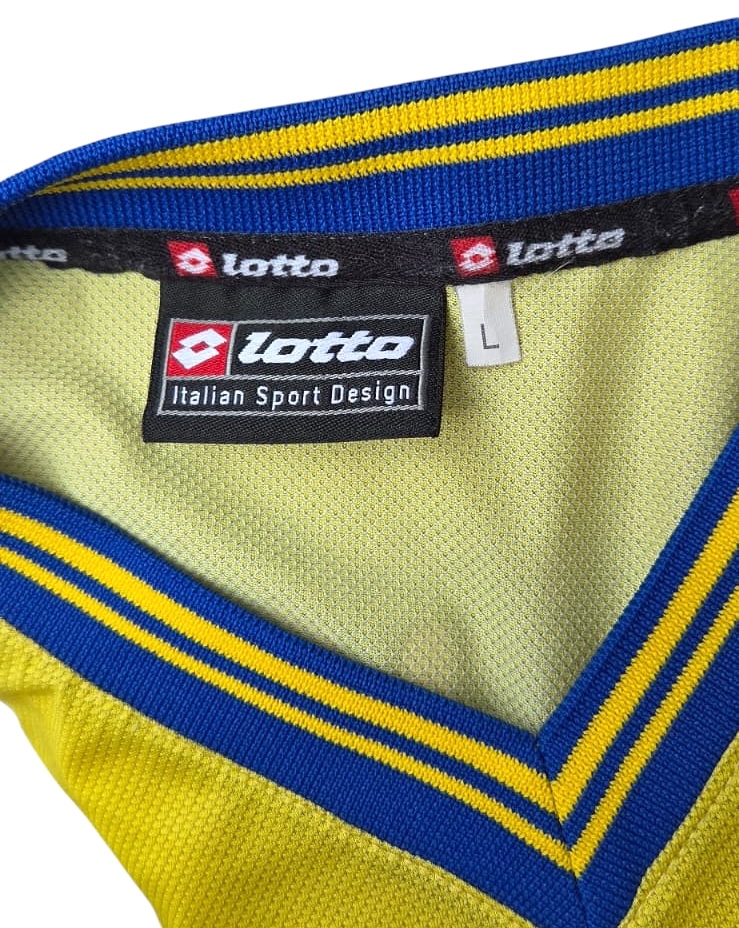 Maglia home del Chievo Verona utilizzata nella stagione 2003/2004, firmata dallo sponsor tecnico Lotto, simbolo di una delle stagioni più affascinanti del club clivense in Serie A. Il design presenta la tradizionale combinazione gialloblù: corpo giallo con maniche blu e dettagli in tinta, arricchita dal colletto a V bordato giallo e blu. Sul fronte sono applicati lo stemma societario ricamato, il logo Lotto e lo storico sponsor Paluani, da sempre legato alla squadra. Caratteristica iconica è la sagoma stilizzata del cavaliere, simbolo del club, stampata nella parte inferiore della maglia.