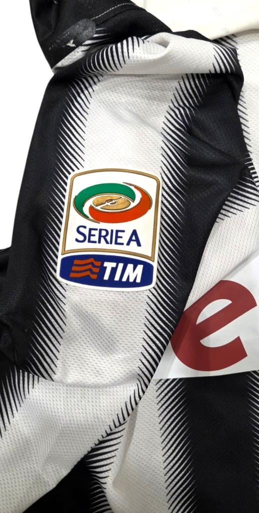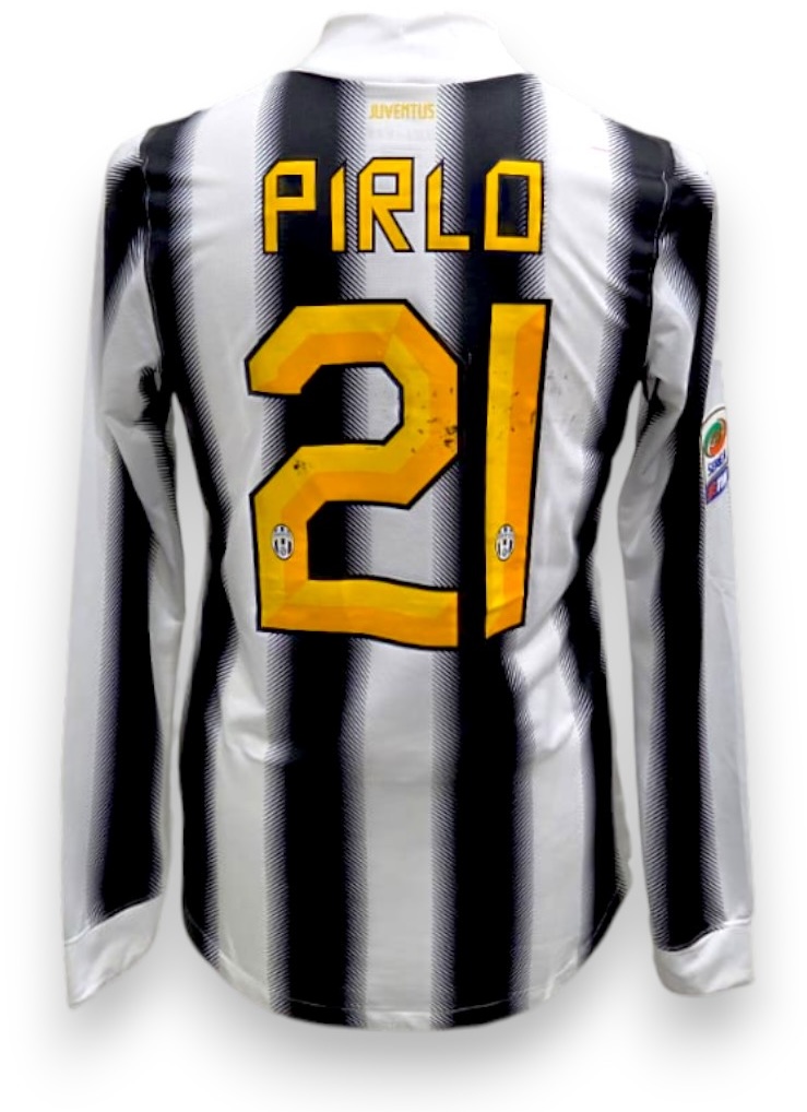 La maglia è a maniche lunghe, con collo a girocollo bianco e inserti in mesh per la traspirazione. Sulla manica destra è applicata la patch ufficiale della Serie A TIM. Sul retro è presente il nome PIRLO e il numero 21 in stampa gialla con dettagli neri, abbinati allo stemma Juventus ripetuto all’interno dei numeri. Questa maglia segna l’inizio del ciclo vincente di Pirlo con la Juventus, stagione culminata con la conquista dello scudetto imbattuti.